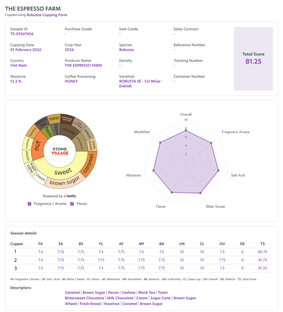 Bảng điểm Cupping Robusta Honey Cư M’Gar The Esspresso mùa vụ 2025 – 2026
